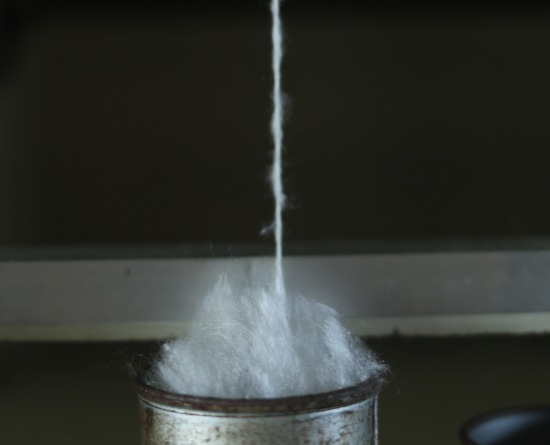 さらに近江の真綿を仕入れ、ガラ紡機で絹紡糸を紡ぐ。 繊維の絡み方、粘っこく引きの強さ、撚りの入り方。 綿とは異なる特性から絹に合わせてガラ紡機を調整する。